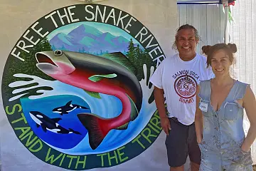 At the ‘Rally for Salmon’ in Portland, Oregon, on June 25th, Northwest Artists Against Extinction artist Gabrielle Abbott gifted her canvas mural, Free the Snake, to Julian Matthews and Nimiipuu Protecting The Environment (NPTE).